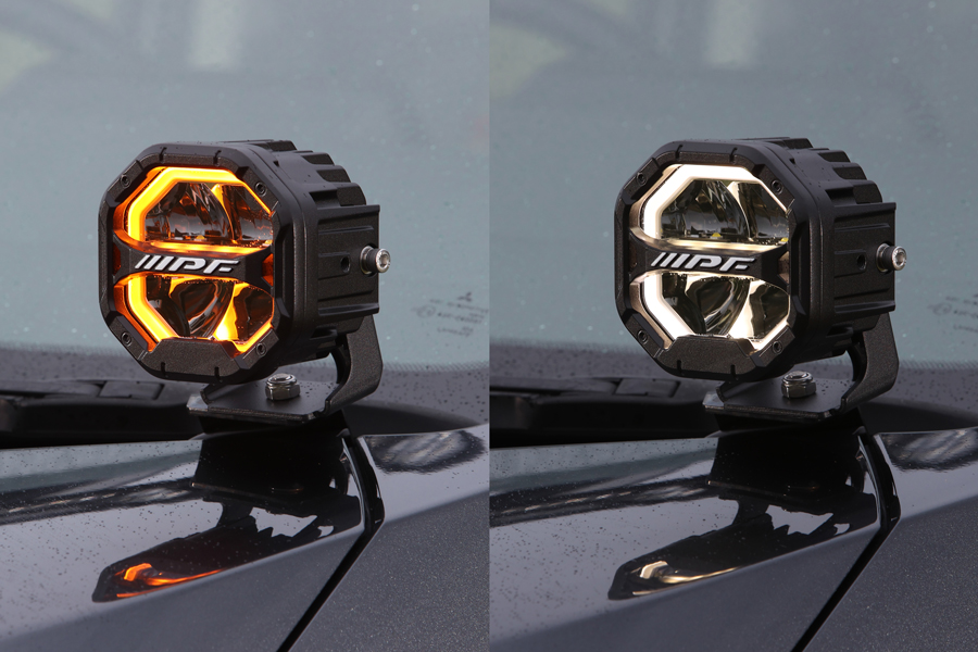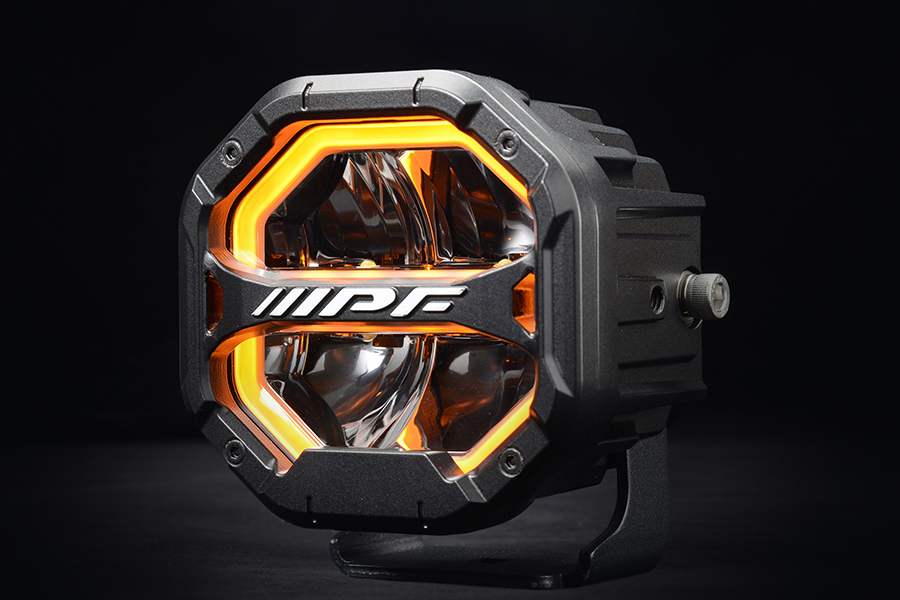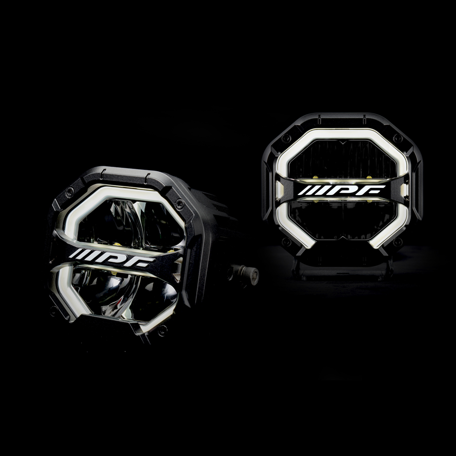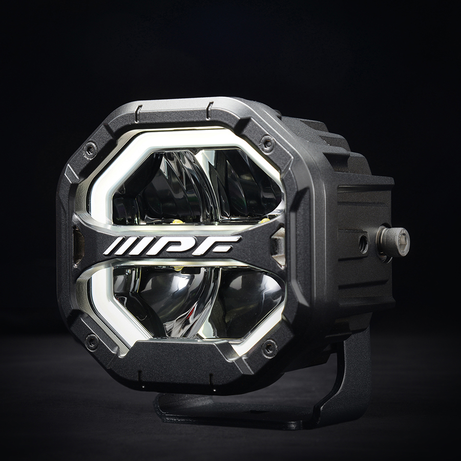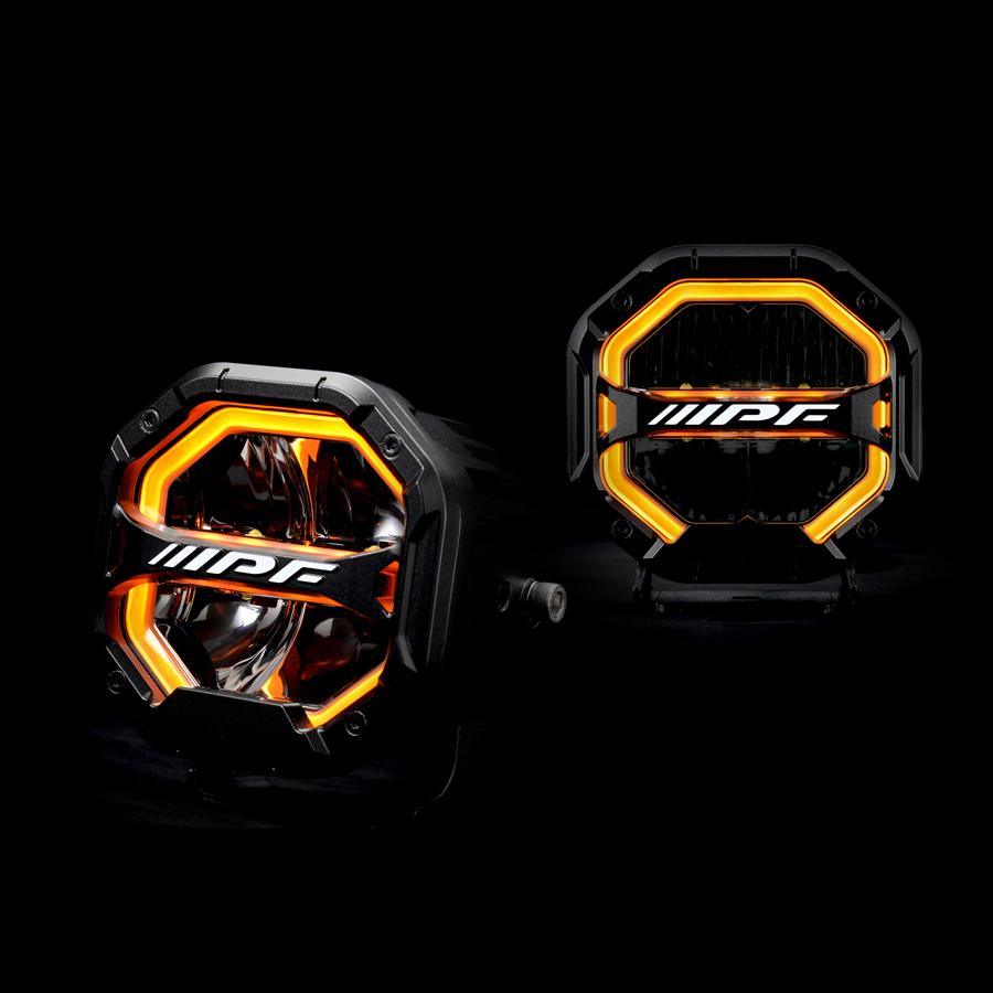 北米のトレンド スタイル、角形LEDオフロード®ランプ4インチサイズ。超高輝度LED x 4個搭載、4,800ルーメンの大光量メインビーム+スタイリッシュなアンバー/ホワイト2色のマーカーランプ*を搭載、付属のスイッチで切替も可能。IPFロゴが印象的なアルミダイキャスト製エクストリーム・ガードリムが過酷な状況下で灯体をしっかりと守り、オクタゴン(8角形)のメカニカルなデザインが車両をラギッドな印象に引き立てます。