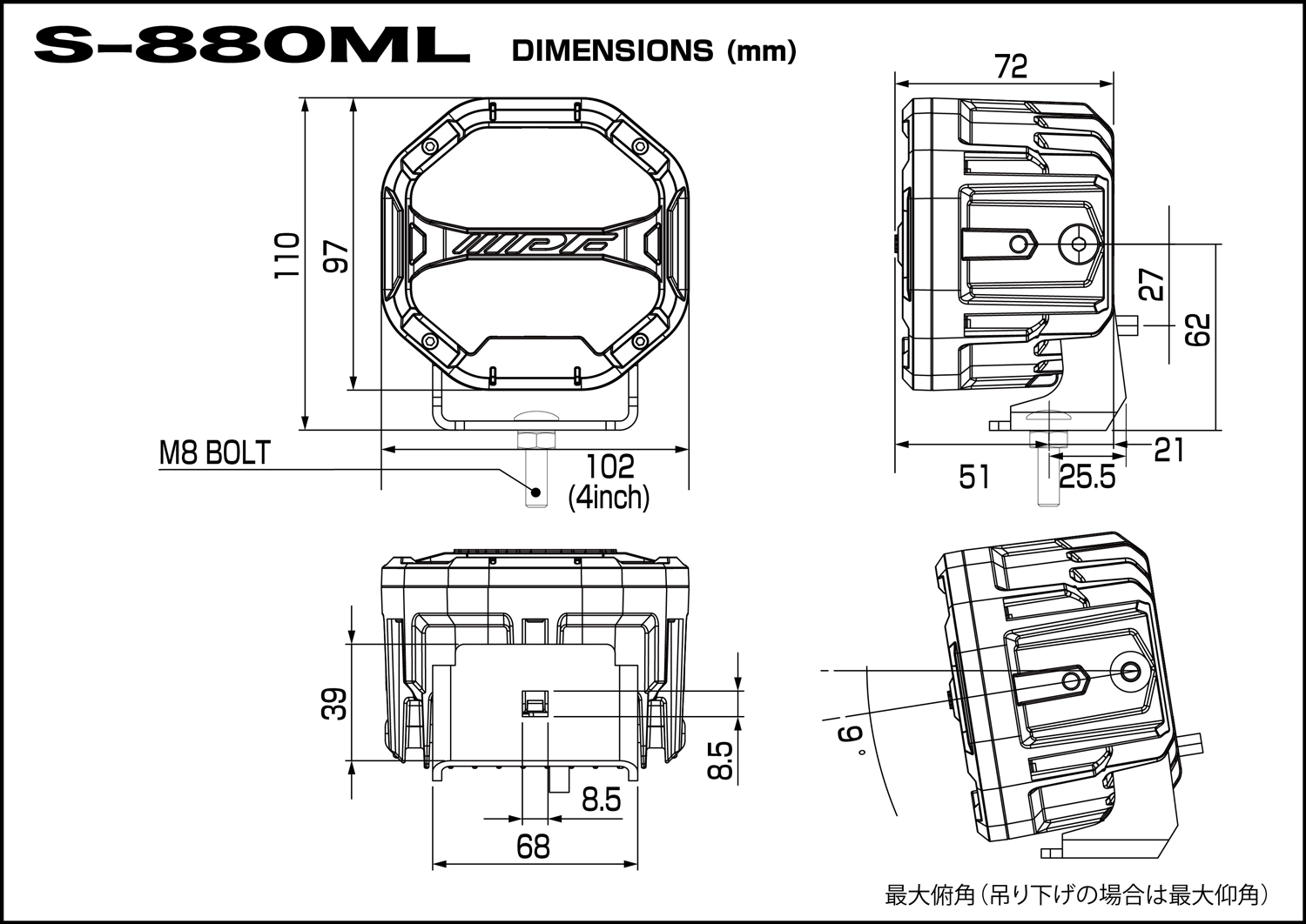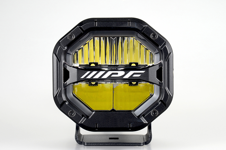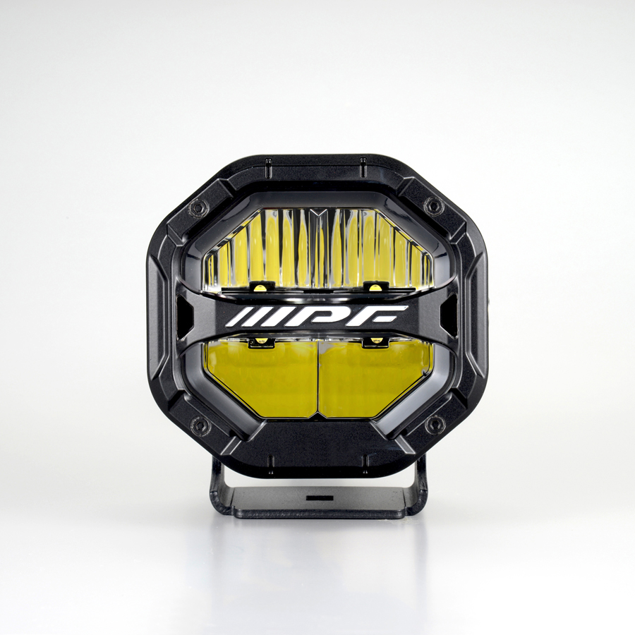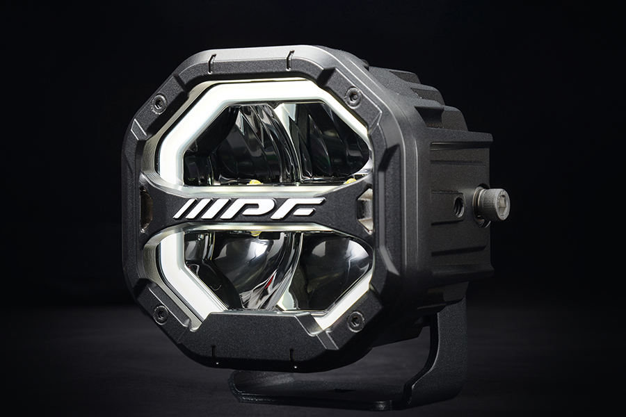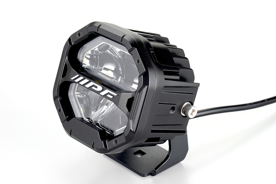 北米のトレンド スタイル、角形LEDオフロード®ランプ4インチサイズ。超高輝度LED x 4個搭載、4,800ルーメンの大光量メインビーム+スタイリッシュなアンバー/ホワイト2色のマーカーランプ*を搭載、付属のスイッチで切替も可能。IPFロゴが印象的なアルミダイキャスト製エクストリーム・ガードリムが過酷な状況下で灯体をしっかりと守り、オクタゴン(8角形)のメカニカルなデザインが車両をラギッドな印象に引き立てます。
