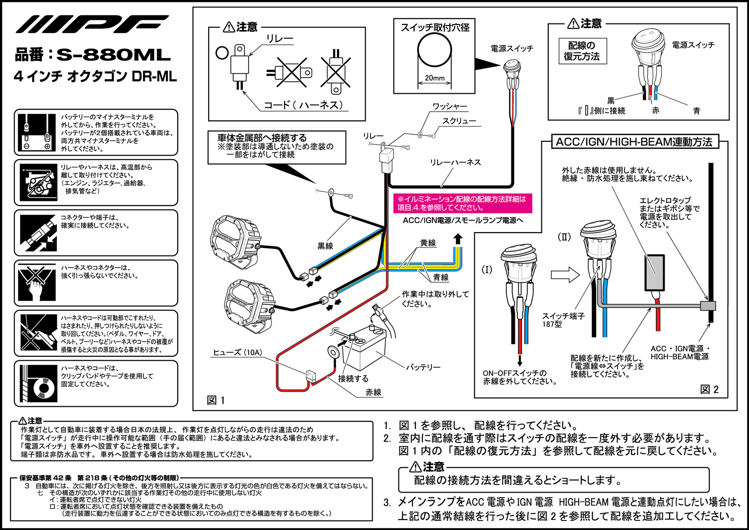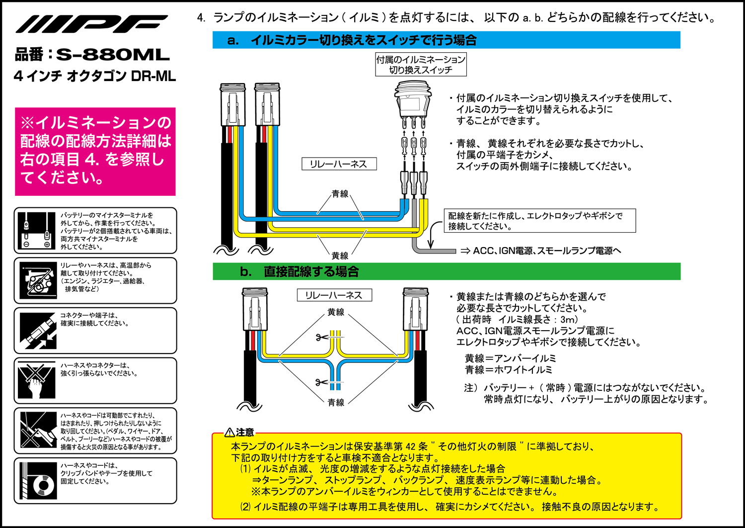 本製品を『作業灯』としてご使用の際は以下の取付方法及びご使用方法をお守りください。『車検非対応』となってしまいます