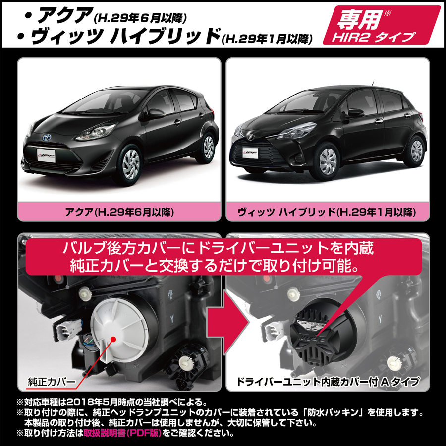 LED ヘッドランプバルブ X3 コンパクトモデルには、トヨタ アクア(H29 年6 月以降)/ヴィッツハイブリッド(H29 年1 月以降) に完全対応する「カバー付A タイプ」もラインナップ。