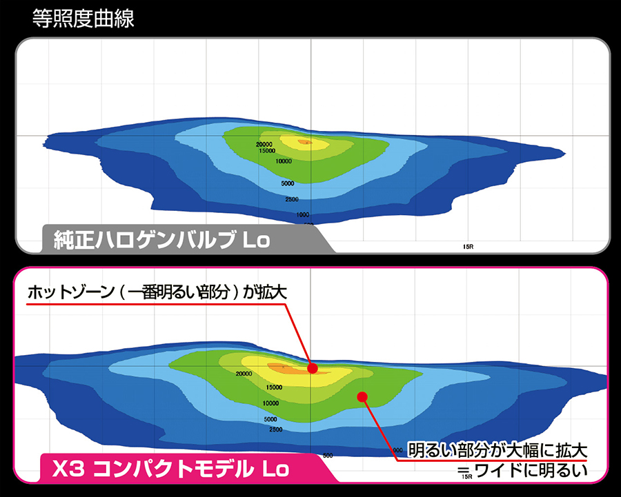 また、「車検測定ポイント(ホットゾーン)の光度がさらに向上。」より安心安全で快適なナイトドライブを提供する完全配光を実現しました。
