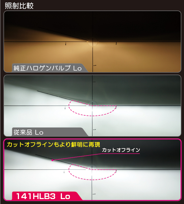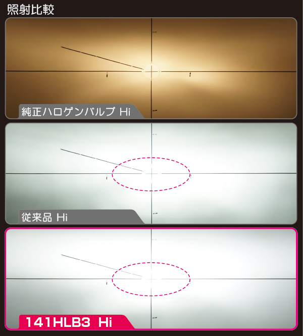 「OEM品質クラスの高い信頼性を確保し、明るい中心光度で、遠くまで明るく光が届く」「専用の新型LEDを使用し、明暗ムラの少ない配光性能と視認性に優れた純白光」。より安心安全で快適なナイトドライブを提供する完全配光を実現しました。