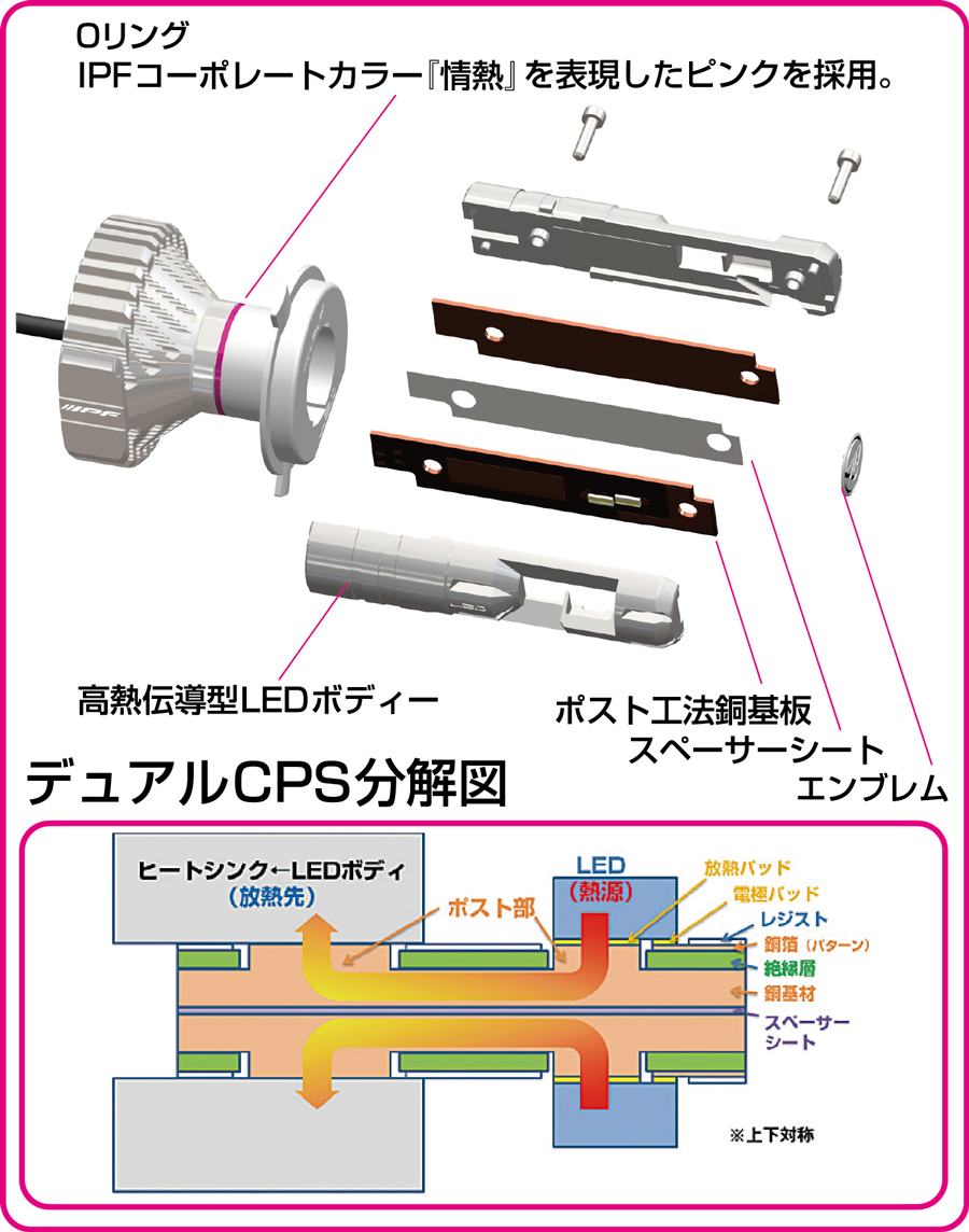IPF製LEDヘッドランプバルブのLED基板には高度な製造技術を要する“ポスト工法”で製造された銅基板を採用。