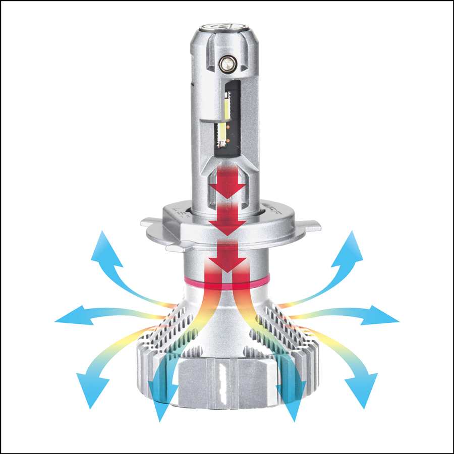 LEDヘッドランプバルブ開発のキーとなり、二律背反とも言える配光性能と明るさの両立。配光性能を追求するとバルブは薄型化される一方で、LEDチップの廃熱・冷却の面では厚型構造の方が有利。冷却性能の良し悪しは、LEDバルブのパワー(=明るさ:ルーメン数)を決定づける重要な要素となります。これらを両立するため、X3シリーズは伝統と信頼の3つのテクノロジーを投入。