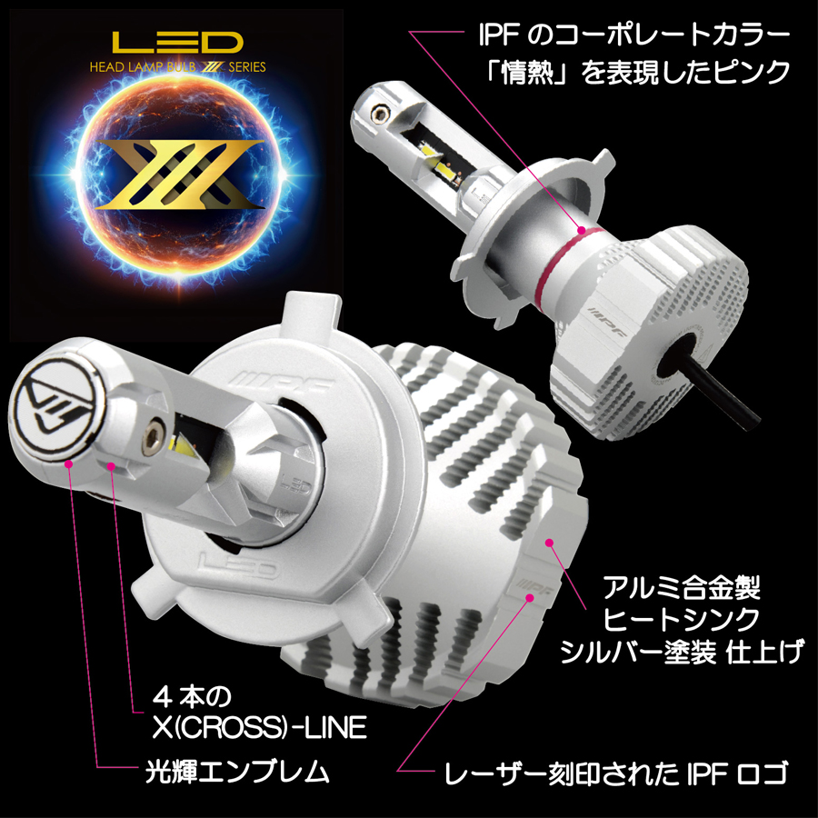 IPF LEDヘッドランプバルブのDNAを継承する X(Cross)-LINE CONCEPT をX3シリーズでも踏襲。LEDから発せられた力強い光をイメージした4本のクロスラインを取り入れ、力強さとスピード感を強調しています。シルバー塗装仕上げのアルミ合金製ヒートシンク。その側面にはレーザー刻印されたIPFロゴを配し、IPFのコーポレートカラー「情熱」を表現したピンクをOリングに採用。IPFブランドの想いが込められた外観デザインは、比類の無い本物の証です。