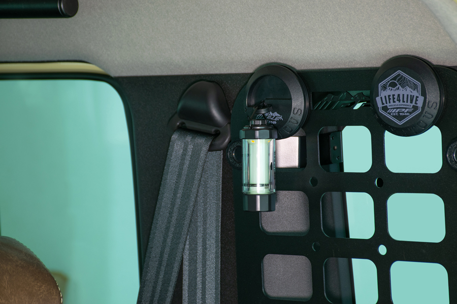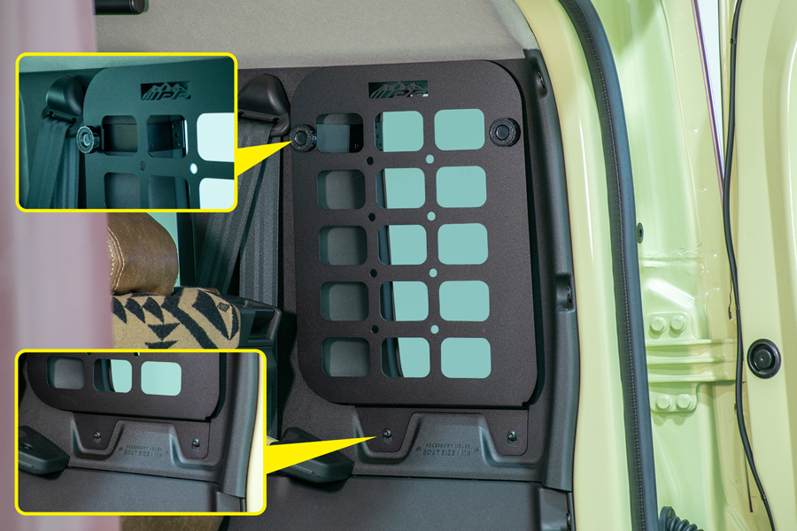 角穴と丸穴の開いたパネルによりモールシステムに対応した小物ケースやポーチの固定が可能。
