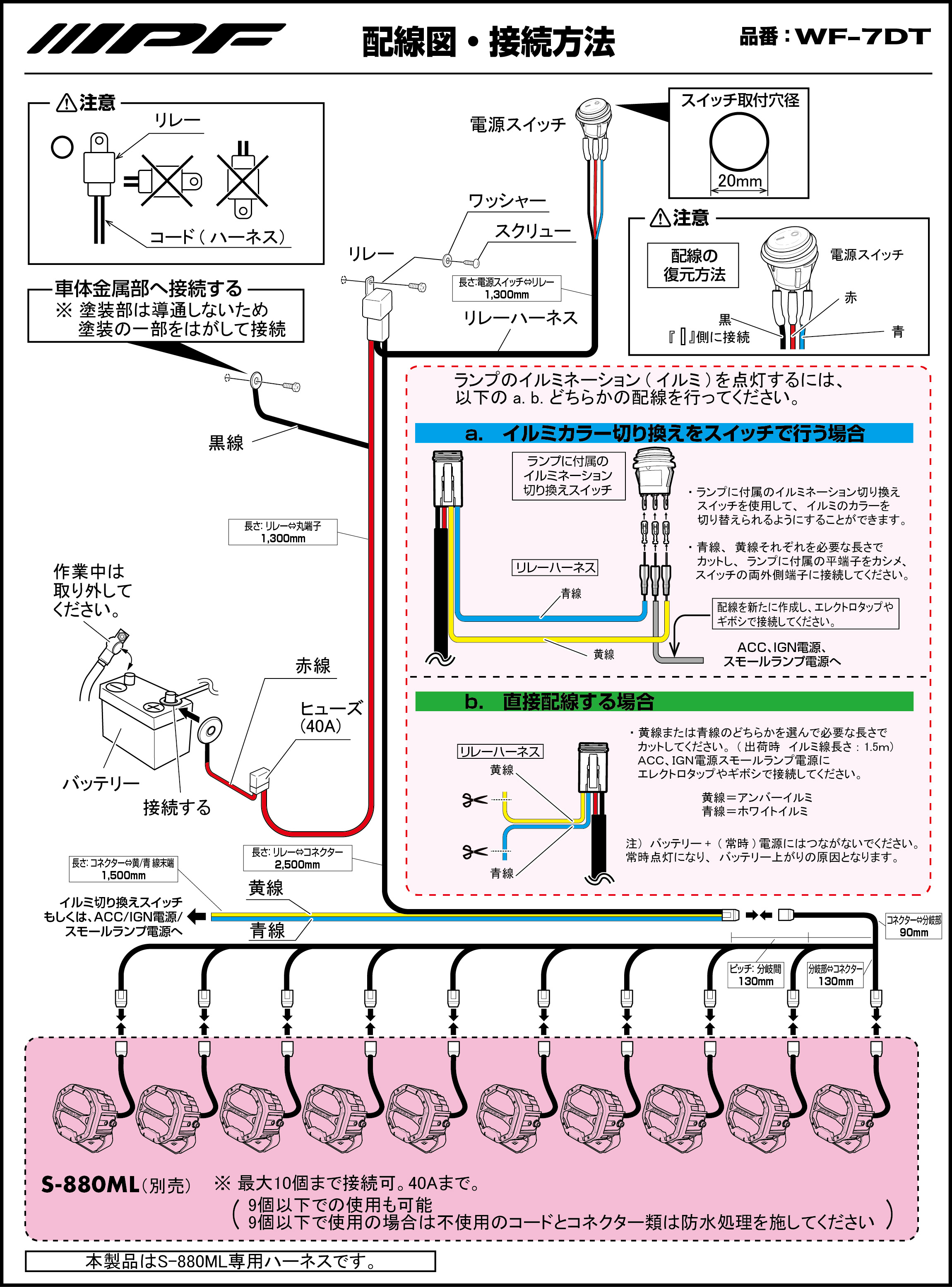 ■ 製品名:S-880ML用 10連ハーネス ■ 品番: WF-7DT ■ 定格: 12V / MAX: 480W 40A | 24V*/ MAX: 960W 40A (*WA-18:別売リレーで24V可能)