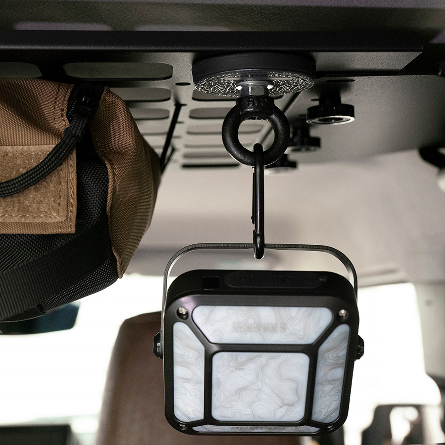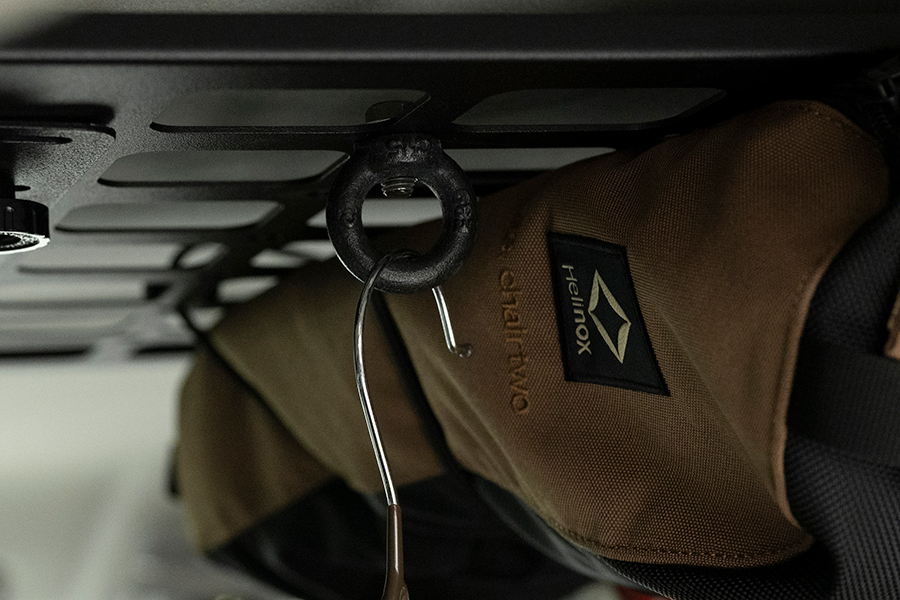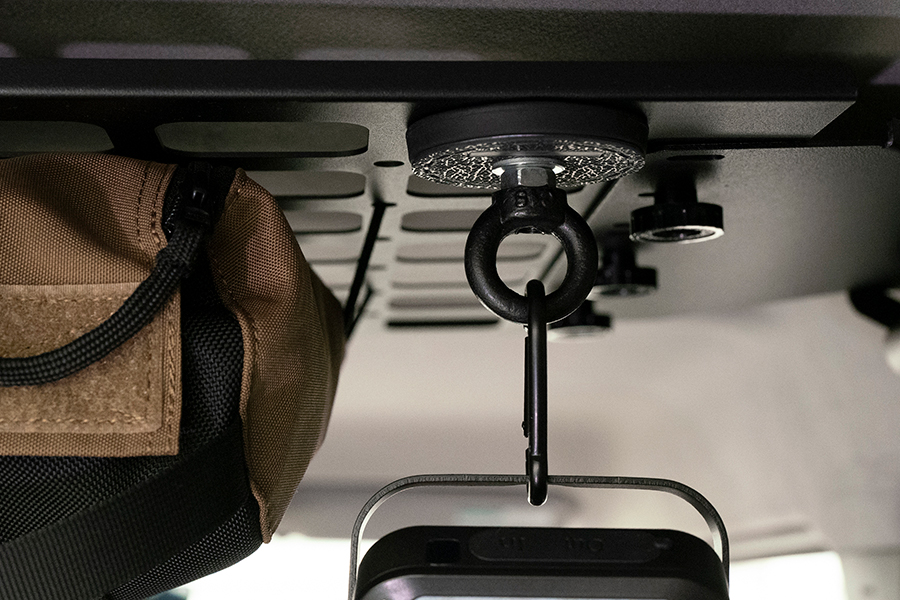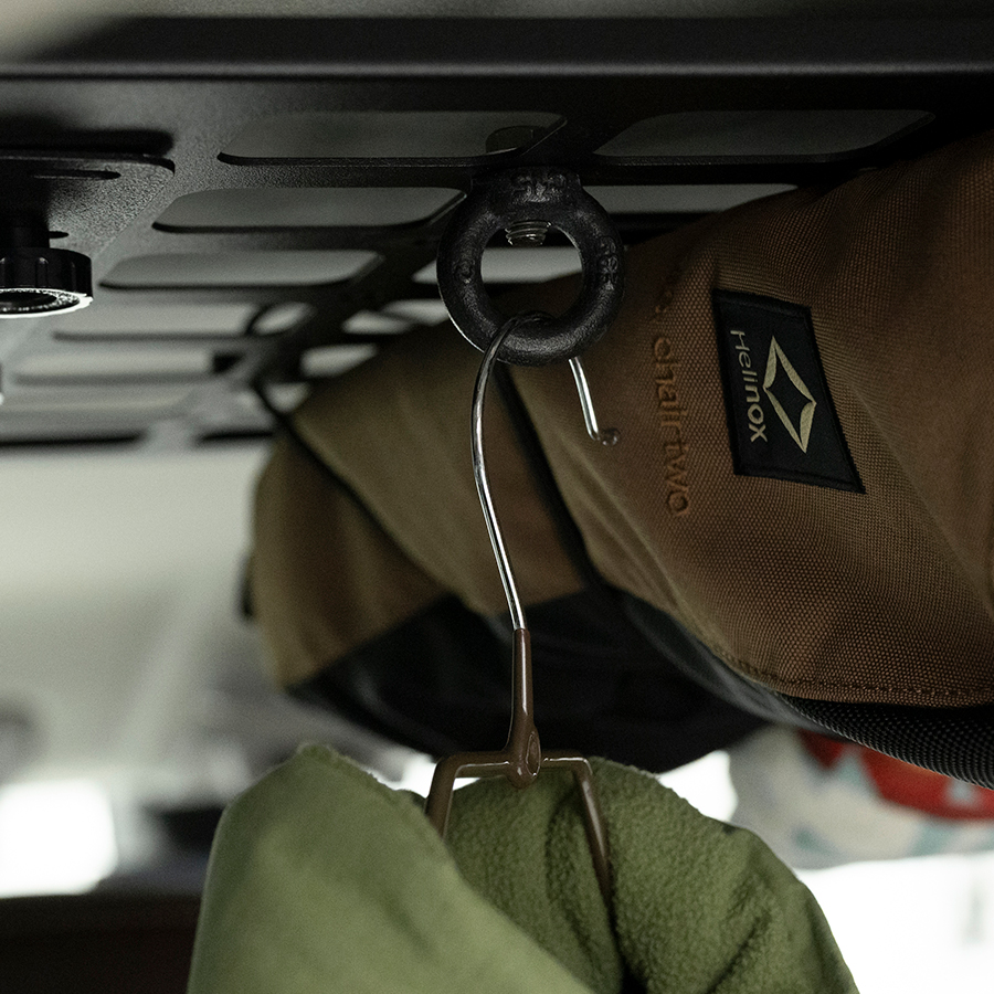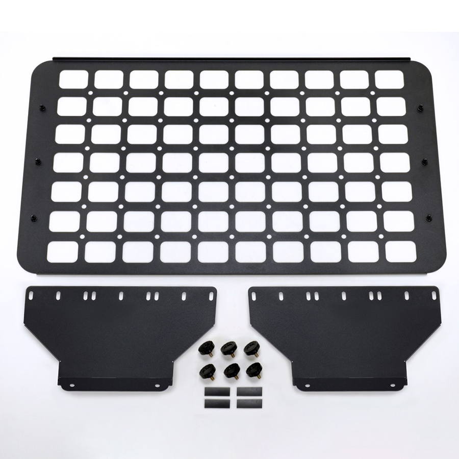 角穴と丸穴の開いたパネルによりモールシステムに対応した小物ケースやポーチの固定が可能。